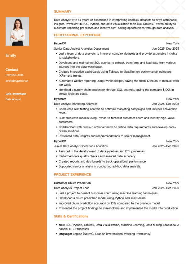 Data Analyst Resume Template, suitable for 5+ years experienced professionals seeking data analysis roles.